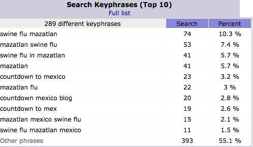 I thought you might also be interested in something from my website statistics. Usually people find this blog by Googling a variety of terms – retire, boomer, México, Mazatlán, etc. etc. Take a look at the top ten search terms people are using to find my blog now.