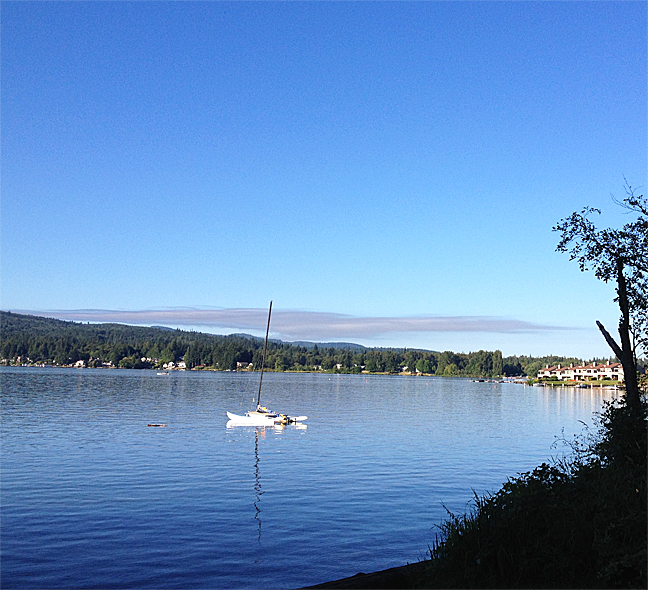 Lake Whatcom isn’t far from their house and we always go out on their boat. This time we took lunch and then spent some time swimming and relaxing. The dog also likes to fetch her ball over and over so of course we did that, too. Below is a picture I took on my walk one morning. Gorgeous.